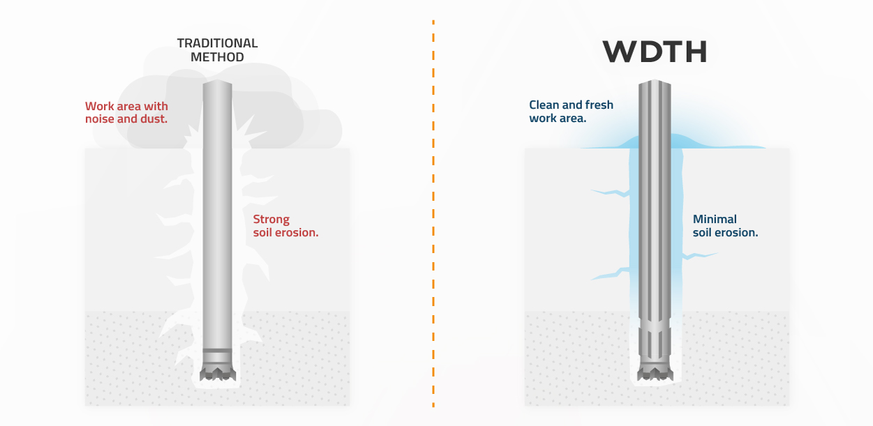 Drilling system without deviation powered by high water pressure for high performance of surface and underground drilling operations.